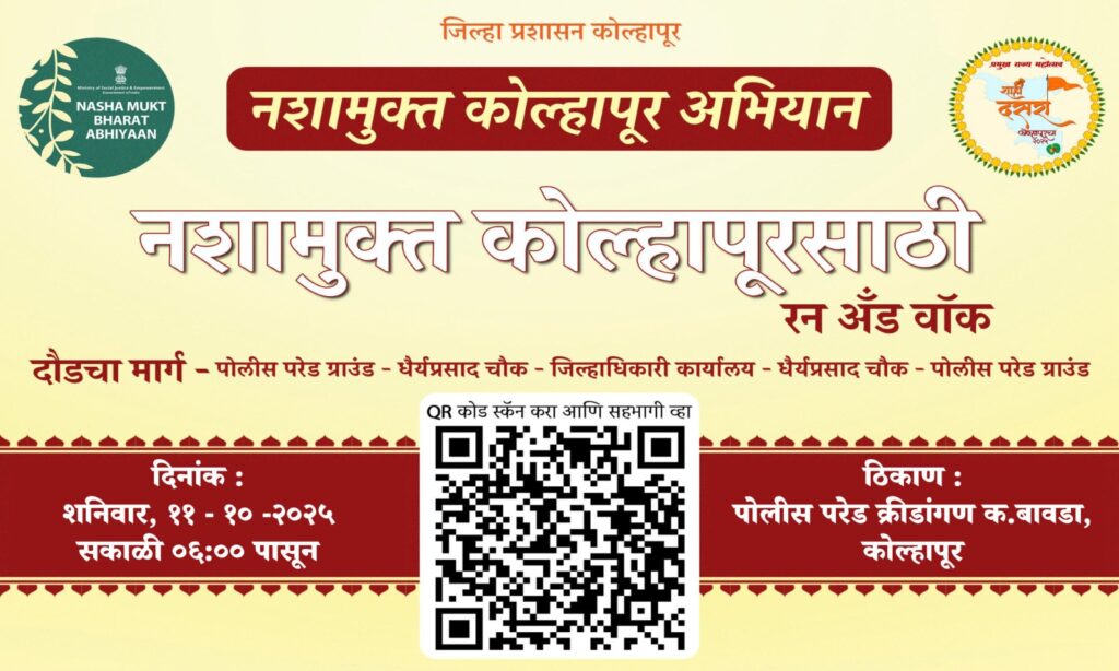 कोल्हापूर, दि. 9 (जिमाका) : नशामुक्त कोल्हापूर या अभियानातर्गंत उदया म्हणजे शनिवार दि . 11 ऑक्टोबर रोजी सकाळी 6 वाजता रॅलीचे आयोजन करण्यात आले आहे . नशामुक्त कोल्हापूर अभियान पंधरवडा 15 ते 29 सप्टेंबर या कालावधीत आयोजित करण्यात आला होता. यापूर्वी या उपक्रमांर्गंत 28 सप्टेंबर रोजी शहरात 5 किमी रन आणि वॉक (धावणे-चालणे) या उपक्रमाचे जिल्हा प्रशासनातर्फे आयोजन करण्यात आले होते.