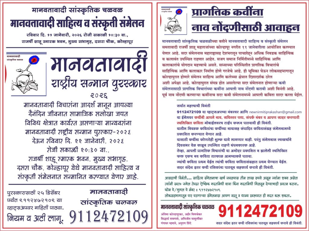 कोल्हापूर – समतावादी विचारांचे पुरस्कर्ते राजर्षी शाहू महाराज यांच्या कोल्हापूर नगरीत येत्या 11 जानेवारी 2026 रोजी मानवतावादी सांस्कृतिक चळवळीच्या वतीने “मानवतावादी साहित्य व संस्कृती संमेलन” मोठ्या उत्साहात आयोजित करण्यात येत आहे.