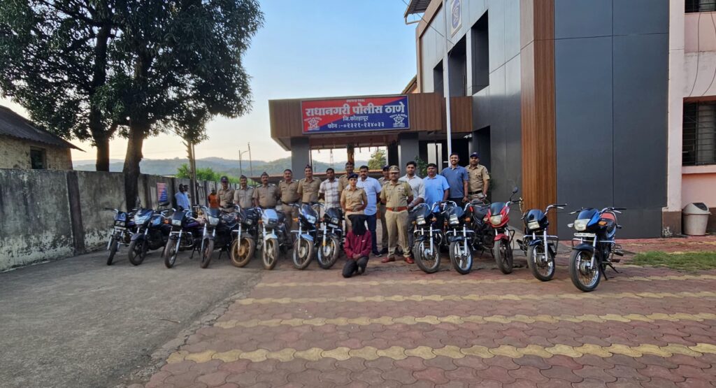 कोल्हापूर शहरातील अनेक चोरींचा उलगडा कोल्हापूर शहर व परिसरात मोटारसायकल चोरीच्या वाढत्या घटनांना आळा घालण्यासाठी राधानगरी पोलिसांनी केलेल्या कारवाईत तब्बल १३ चोरीच्या मोटारसायकलींसह ₹२.५० लाखांचा मुद्देमाल जप्त करण्यात आला आहे. या प्रकरणी युवराज उर्फ विनायक साताप्पा कांबळे (वय ३६, रा. नरतवडे, ता. राधानगरी) या संशयित चोरट्याला अटक करण्यात आली आहे.ही कारवाई मा. पोलीस अधीक्षक श्री. योगेश कुमार साहो, अपर पोलीस अधीक्षक डॉ. धीरजकुमार साहो व उपविभागीय पोलीस अधिकारी आप्पासो पवार यांच्या मार्गदर्शनाखाली पोलीस निरीक्षक संतोष गोरे यांच्या नेतृत्वाखाली करण्यात आली.गुप्त माहितीवरून सापळाराधानगरी ट्रॅफिक पोलिस अंमलदार रणधीर वरोटे यांना मिळालेल्या गोपनीय माहितीवरून राधानगरी पोलिसांनी तत्काळ तपास पथक तयार केले. या पथकात सहाय्यक फौजदार पारळे, पोहेकॉ खामकर, शेळके, पोलीस शिपाई वरोटे, पोवार, पाटील, गुरव, किरण पाटील, भोपळे, बरगे आणि चालक गुरव यांचा समावेश होता.सदर पथकाने आरोपी विनायक कांबळे याला चौकशीसाठी ताब्यात घेतले असता त्याच्याकडून कोल्हापूर शहरातील विविध ठिकाणांहून चोरी करण्यात आलेल्या अनेक मोटारसायकली हस्तगत करण्यात यश आले. या गाड्यांपैकी काहींचे चोरीचे गुन्हे आधीच जुना राजवाडा पोलीस ठाणे (४ गुन्हे) व शाहुपुरी पोलीस ठाणे (४ गुन्हे) येथे नोंद असल्याचे समोर आले आहे. उर्वरित पाच वाहनांची नोंदणी माहिती अपूर्ण असून त्या वाहनांच्या मूळ मालकांचा शोध सुरु आहे.चोरीच्या वाहनांची यादीजप्त करण्यात आलेल्या वाहनांमध्ये प्रामुख्याने हिरो होंडा स्प्लेंडर, स्प्लेंडर प्लस, फॅशन प्रो, सुपर स्प्लेंडर अशा विविध प्रकारच्या मोटारसायकलींचा समावेश आहे. बहुतेक गाड्या काळ्या रंगाच्या असून काहींवर लाल-निळे पट्टे असल्याचे पोलिसांनी सांगितले. या सर्व गाड्यांचे इंजिन व चेसिस नंबर तपासणीसाठी पाठविण्यात आले असून, त्यानुसार संबंधित वाहन मालकांना संपर्क साधून ताबा देण्यात येणार आहे.शहरातील चोरींमागचा मास्टरमाइंड उघडकीसप्राथमिक चौकशीत आरोपी विनायक कांबळे याने कोल्हापूर शहरातील विविध भागांतील वाहनतळांमधून, रस्त्यांवरील वसाहतीतून आणि घरांसमोरून मोटारसायकली चोरल्याची कबुली दिली आहे. आरोपीवर मोटारसायकल चोरीचे एकूण आठ गुन्हे नोंदवलेले आहेत. पोलिसांकडून मिळालेल्या माहितीनुसार, तो शहरात येऊन गाड्या चोरत असे आणि राधानगरी भागात ठेवून विक्रीसाठी ग्राहक शोधत असे.वाहन मालकांना आवाहनपोलिसांनी या प्रकरणात जप्त केलेल्या वाहनांचे इंजिन व चेसिस नंबर तपासून वाहन मालकांनी राधानगरी पोलिस ठाण्याशी संपर्क साधावा, असे आवाहन केले आहे. संबंधित वाहन मालकांनी आपले आवश्यक काग