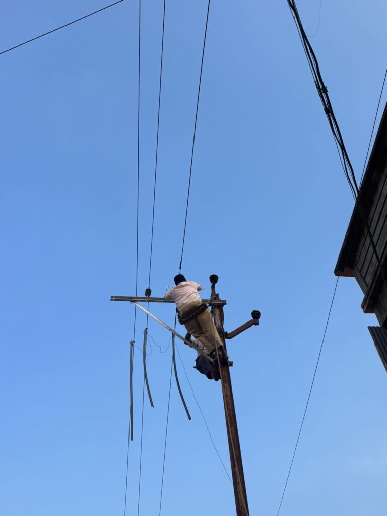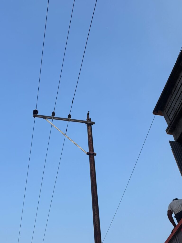 उचगाव (ता. करवीर) येथे वीज वितरण कंपनीच्या वतीने इमारतीला चिकटून असणाऱ्या तारा ब्रॅकेट लावून रस्त्याच्या मध्यभागी घेताना कर्मचारी.