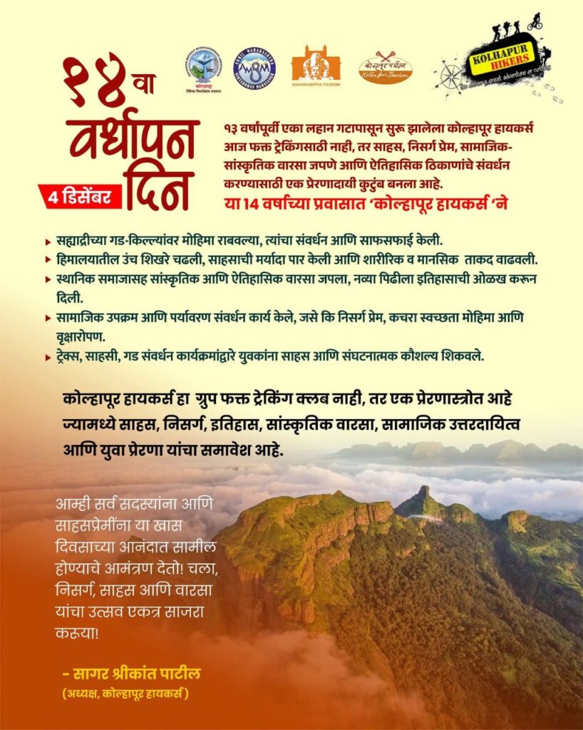 संस्थापक सागर पाटील यांच्या मार्गदर्शनाखाली कार्यरत असलेल्या ‘कोल्हापूर हायकर्स’ कुटुंबाला १४ व्या वर्धापन दिनाच्या मनःपूर्वक शुभेच्छा..