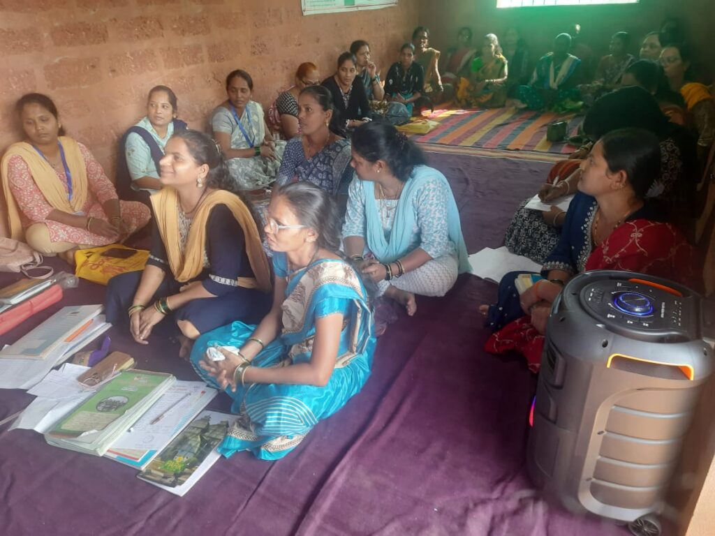 आधी घेतलेल्या माहितीप्रमाणे रत्नागिरी शहरांतील, पोमेंडी या ग्रामीण भागांत संपर्क साधून लोकनियुक्त महिला सरपंच, सौ. ममता जोशी यांची भेट घेतली. महिला सबलीकरण, सक्षमीकरण, भाषा संवर्धन, वाचनालयांची गरज अशा अनेक विषयावर चर्चा करता आली. दिलेल्या पत्रानुसार भेटीची ग्रामपंचायतीतून पोहोच मिळाली. त्यांनी एका बचत गटाच्या CRP [Community Resourse Person] संजना मुदगेकर यांचा संपर्क क्रमांक देत, एखाद्या दिवशी बचत गट मिटींगला हजर रहाण्याचे सुचवले, त्यांच्याशी माझा लगेचच संपर्क झाला. दुसरे दिवशी ‘महाराष्ट्र राज्य ग्रामीण जीवन्नोती अभियान; ‘नक्षत्र महिला ग्रामसंघ’ आदर्श वसाहत, ता. जि. रत्नागिरी या बचत गटाची भेट घेतली. दुपारी दोन ते पाच अशी त्यांची मासिक भेटीची वेळ ठरलेली असते. महिन्यातून एक – दोन दिवस या सर्व महिला एकत्र येतात, तेथे पोहोचताच असे लक्षांत आले की, अनेक बचत गटांच्या प्रमुख मीटिंगसाठी उपस्थित आहेत. बचत गटाच्या परंपरेप्रमाणे त्यांनी टाळ्या वाजवून स्वागत केले. “हीच आमुची प्रार्थना” या गीताने कार्यक्रमाचा प्रारंभ झाला.