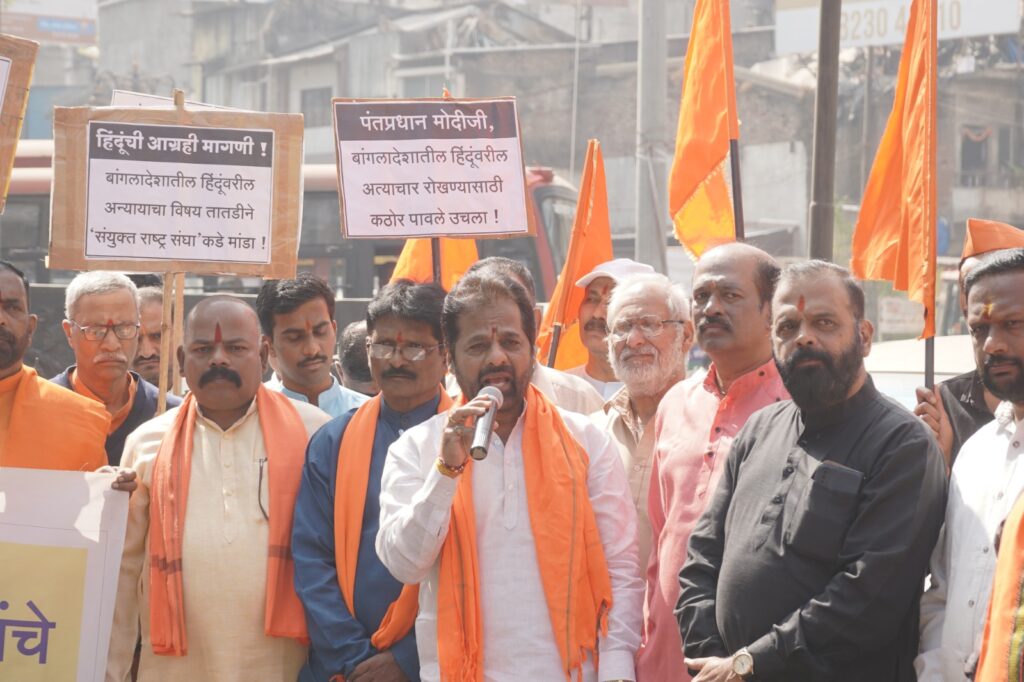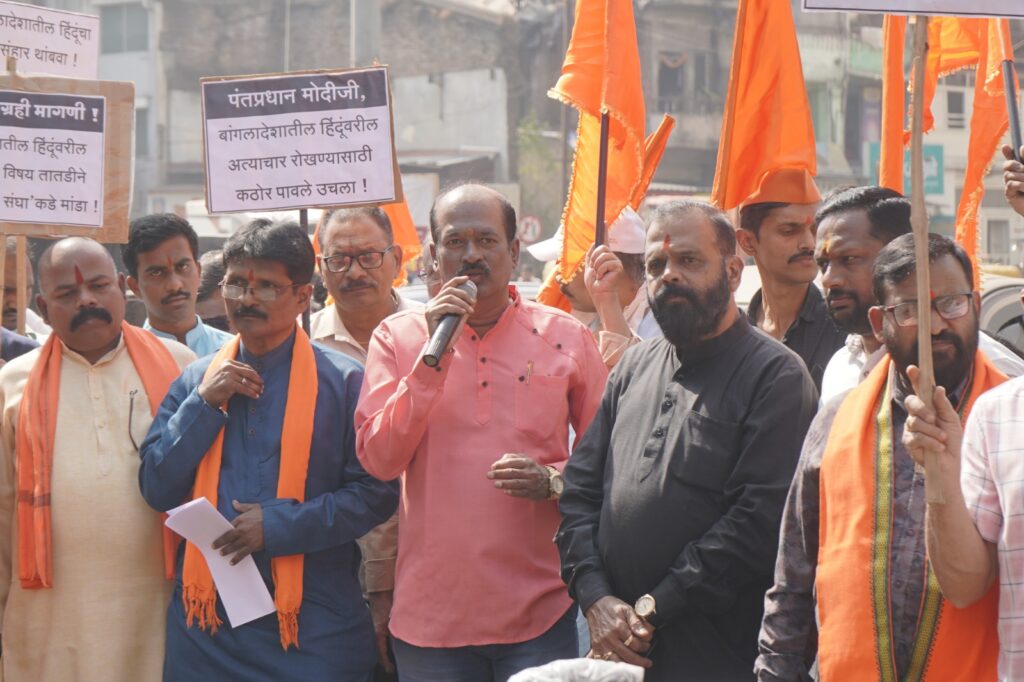 कोल्हापूर - बांगलादेशातील हिंदू दीपू चंद्रदास याची कट्टरतावादी जमावाने झाडाला बांधून जिवंत जाळून हत्या करणे, हिंदूंची घरे, दुकाने जाळणे पुन्हा चालू केले आहे. हिंदु जनजागृती समितीने हिंदूविरोधी हिंसाचाराचा तीव्र निषेध करत पंतप्रधान माननीय नरेंद्र मोदी, केंद्रीय गृहमंत्री माननीय अमित शाह, तसेच बांगलादेश उच्चायुक्त यांच्याकडे हिंदूविरोधी हिंसाचार थांबवण्यासाठी भारत सरकारने बांगलादेशावर आर्थिक, व्यापारिक व राजनैतिक निर्बंध घालावेत यांसह बांगलादेशातील दहशतवादी व कट्टरतावादी घटकांविरुद्ध कठोर कारवाई करावी, अशी प्रमुख मागणी हिंदु राष्ट्र जागृती आंदोलनाद्वारे कोल्हापूर येथे करण्यात आली. हे आंदोलन २६ डिसेंबर या दिवशी छत्रपती शिवाजी महाराज मूर्ती चौक (शिवतीर्थ) करण्यात आले. या प्रसंगी भाजपचे श्री. महेश जाधव, हिंदू युवा प्रतिष्ठानचे संस्थापक श्री. अशोक देसाई, शिवसेनेचे उपजिल्हाप्रमुख श्री. किशोर घाटगे, शिवराष्ट्र धर्म संघटनेचे संस्थापक श्री. दिलीप भिवटे, शिवशाही प्रतिष्ठानचे संस्थापक श्री. सुनील सामंत, सनातन संस्थेचे डॉ. मानसिंग शिंदे आणि हिंदु जनजागृती समितीचे श्री. शिवानंद स्वामी यांनी त्यांचे मनोगत व्यक्त केले. सूत्रसंचालन हिंदुत्वनिष्ठ श्री. रामभाऊ मेथे यांनी केले.