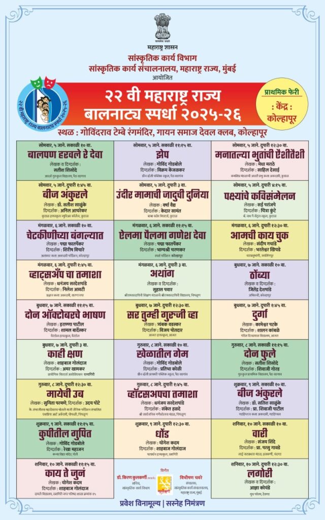 कोल्हापुरात, गोविंदराव टेंबे रंग मंदिर देवल क्लब येथे दिनांक ५ जानेवारी रोजी बालनाट्य स्पर्धेची सुरुवात होत आहे. यामध्ये कोल्हापुर शहरातील तसेच पेठ वडगाव, आजरा, गडहिंग्लज, जयसिंगपूर वारणानगर, रत्नागिरी, देवगड, चिपळूण, पोफळी, निरबाडे, कुडाळ, चंदगड इत्यादी भागातील नाट्य संस्था सहभागी होत आहेत. कोल्हापूर आणि सांगली हे विभागून केंद्र असून कोल्हापूर केंद्रावर २६ बाल नाट्य आणि सांगली केंद्रावर २४ बालनाट्य होतील. कोल्हापुर केंद्रावर दिनांक १० जानेवारी रोजी स्पर्धा पूर्ण होईल आणि दिनांक १३ जानेवारीपासून सांगली केंद्रावर बालनाट्य स्पर्धा सुरू होईल. रसिक प्रेक्षकांना विनामूल्य बालनाट्य पाहता येतील. शाळांनी आपल्या विद्यार्थी विद्यार्थिनींना बालनाट्याचा आनंद घेण्यासाठी, आणि बालकलाकारांना प्रोत्साहन देण्यासाठी पाठवावे असे आवाहन सांस्कृतिक कार्य संचालक श्री बिभीषण चवरे यांनी केले आहे.