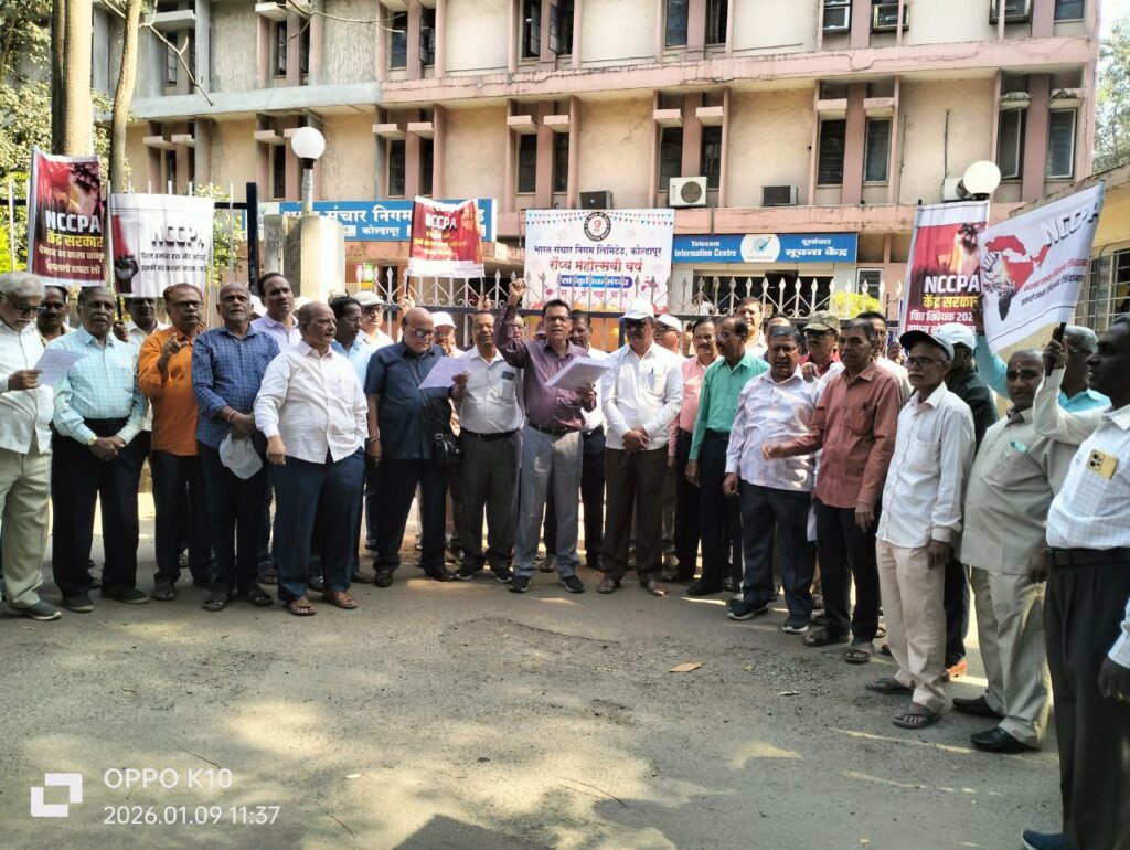केंद्र सरकारने मंजूर केलेल्या वित्त कायद्यातील अन्यायकारक तरतुदींविरोधात बीएसएनएलमधील सेवानिवृत्त कर्मचाऱ्यांनी शुक्रवारी (दि. ०९ जानेवारी २०२५) तीव्र आंदोलन छेडले. संचार निगम पेन्शनर्स वेलफेअर असोसिएशन (SNPWA), शाखा कोल्हापूर यांच्या वतीने आणि फोरम ऑफ सिव्हिल पेन्शनर्स असोसिएशन (FCFA) च्या आवाहनानुसार संपूर्ण देशभर एकाचवेळी निदर्शने करण्यात आली.