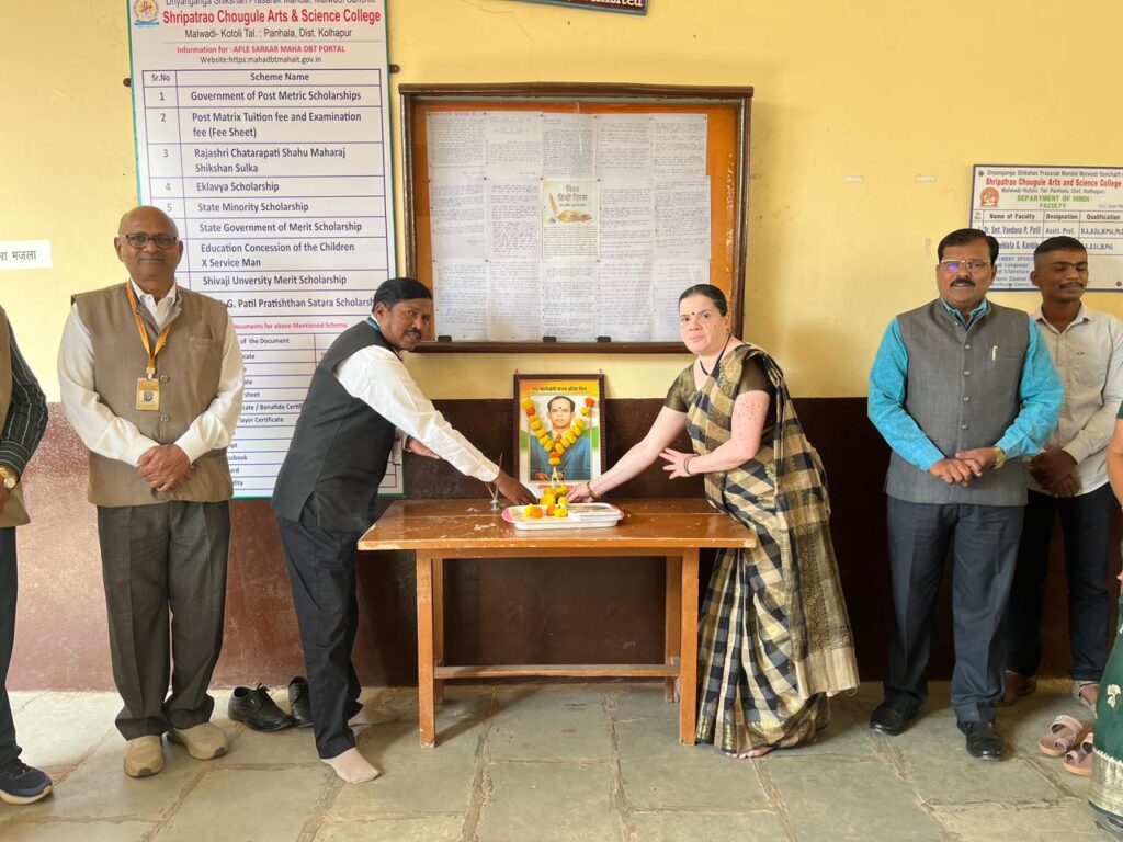 फोटो ओळ : श्रीपतराव चौगुले कॉलेजमध्ये ऑलिम्पिक वीर खाशाबा जाधव यांच्या प्रतिमेचे पूजन करताना डॉ. एस. एस. कुरलीकर व सौ. सीमा पाटील; समवेत प्राचार्य डॉ. विजयकुमार पाटील, सौ. तेजस्विनी पाटील, प्रा. दत्तात्रय नाईक, डॉ. यू. एन. लाड व मान्यवर.