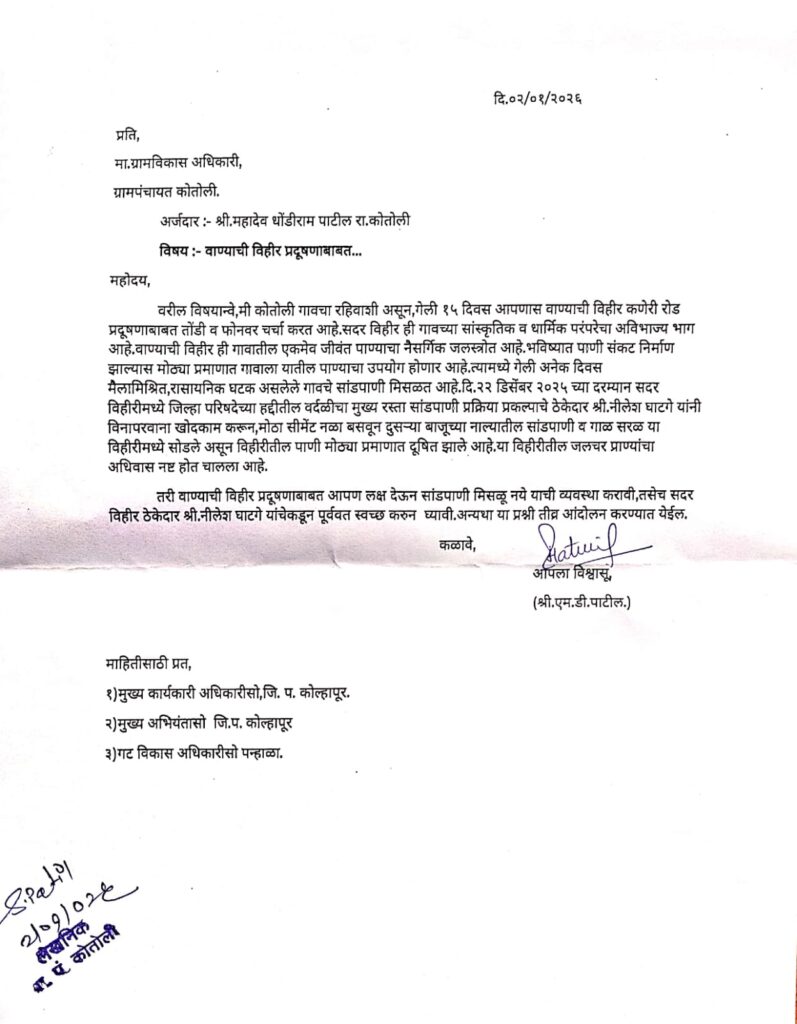 “सांडपाणी तात्काळ थांबवावे, विहीर पूर्ववत स्वच्छ करून द्यावी आणि दोषी ठेकेदारावर कठोर कारवाई करावी, अन्यथा कोतोली गाव तीव्र आंदोलन छेडेल,” असा स्पष्ट इशारा देण्यात आला आहे.