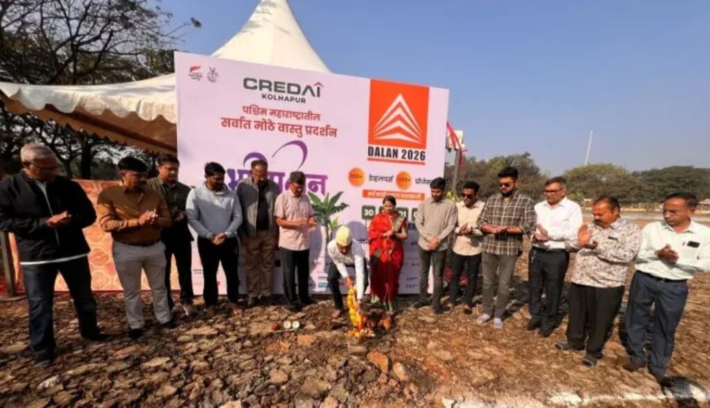 पश्चिम महाराष्ट्रातील बांधकाम व्यावसायिकांची सर्वोच्च संघटना असलेल्या क्रिडाई कोल्हापूर तर्फे आयोजित करण्यात येणाऱ्या भव्य वास्तू व बांधकाम विषयक प्रदर्शन ‘दालन 2026’ च्या मंडप उभारणीस आज अधिकृत सुरुवात झाली. येत्या ३० जानेवारी ते २ फेब्रुवारी २०२६ या कालावधीत महासैनिक दरबार हॉल ग्राउंड, कोल्हापूर येथे हे प्रदर्शन भरविण्यात येणार आहे.