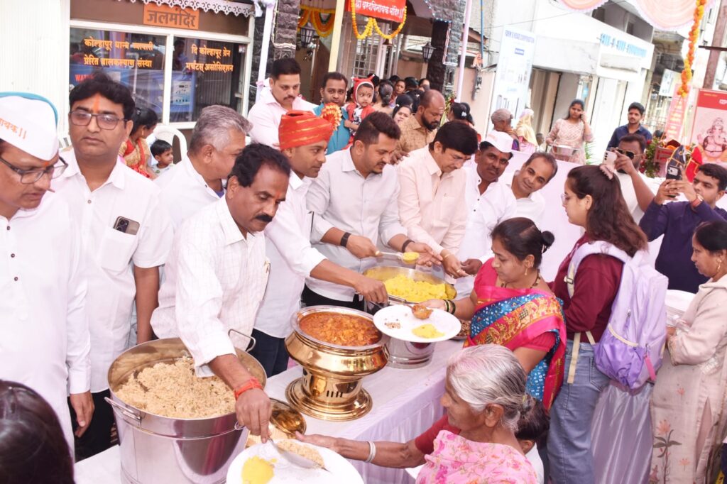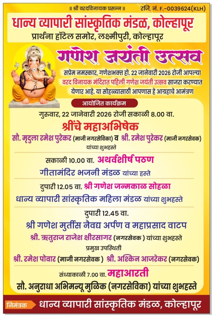 कोल्हापुर :-लक्ष्मीपुरी येथील धान्य व्यापारी सांस्कृतिक मंडळाच्या वतीने गणेश जयंती निमित्त विविध कार्यक्रमाचे आयोजन करण्यात आलं होतं. सकाळी ८ वा माजी नगरसेवक श्री रमेश पुरेकर व सौ मृदुला पुरेकर यांच्या हस्ते अभिषेक करण्यात आला.त्यानंतर मंदिर परिसरामध्ये अथर्वशीर्ष पठण करून दुपारी १२ वाजून ५ मिनिटांनी जन्मकाळ सोहळा असंख्य महिलांच्या उपस्थित संपन्न होऊन महाआरती करण्यात आली तसेच कोल्हापूर महानगरपालिकेचे नूतन नगरसेवक मा. श्री ऋतुराज क्षीरसागर , नगरसेवक आश्किन सुभेदार , बालकल्याण संस्थेचे अध्यक्ष श्री विवेक शेटे उपाध्यक्ष श्री अमर क्षिरसागर यांच्या शुभहस्ते महाप्रसाद वाटप करण्यात आले.अनेक गणेश भक्तांनी या महाप्रसादाचा लाभ घेतला.
