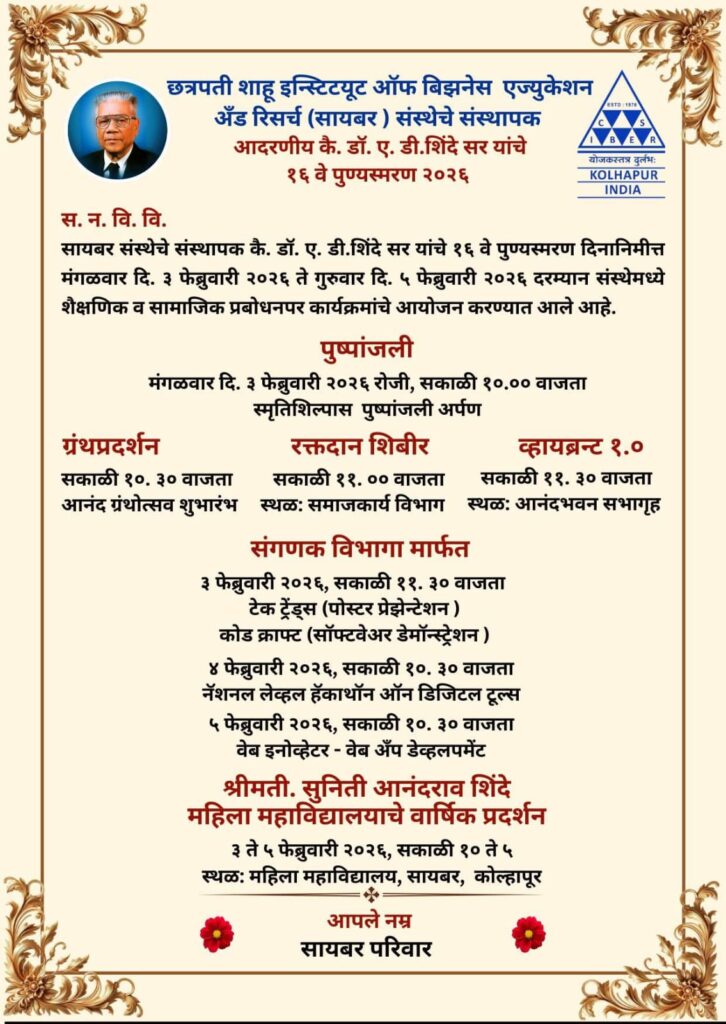 संस्थेचे संस्थापक, दूरदृष्टी असलेले शिक्षणतज्ज्ञ स्व. डॉ. ए. डी. शिंदे सर यांच्या १६ व्या पुण्यतिथीनिमित्त दिनांक ३ फेब्रुवारी २०२६ रोजी संस्थेमध्ये विविध शैक्षणिक व सामाजिक जनजागृती उपक्रमांचे आयोजन करण्यात आले आहे. शिक्षण, संशोधन, नवोपक्रम आणि सामाजिक जबाबदारी या मूल्यांवर आधारित संस्थेचा पाया घालणाऱ्या डॉ. शिंदे सरांच्या स्मृतींना आदरांजली वाहण्यासाठी हा उपक्रम आयोजित करण्यात येत आहे.