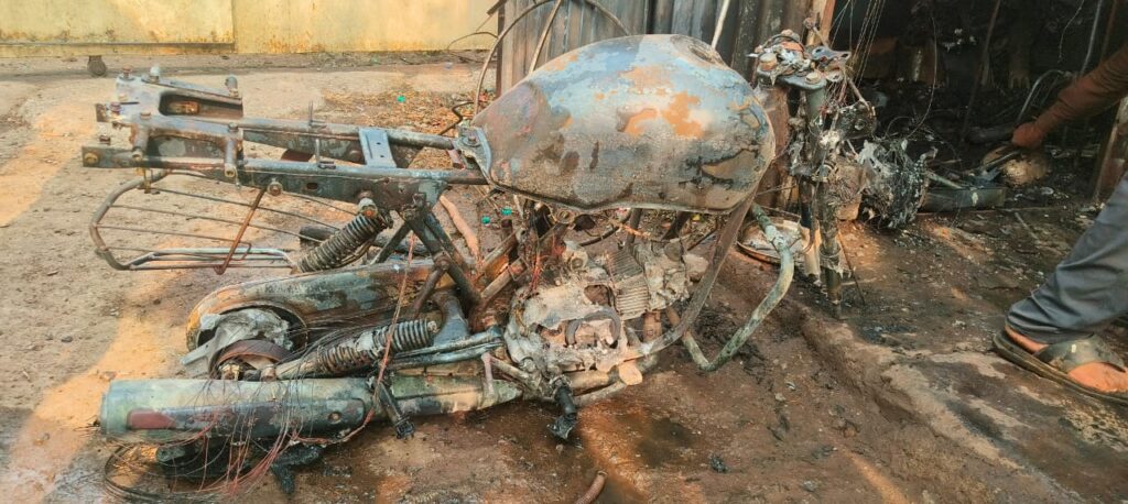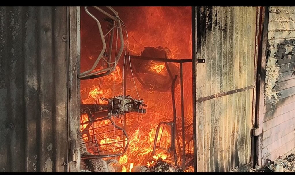 घटना स्थळावरून मिळालेली सविस्तर माहिती अशी की सदरची दोन्ही दुकान गाळे सुरेश यशवंत गायकवाड यांच्या मालकीची असून त्या एका गाळ्यात विजय तुकाराम शिर्के रा वाठार यांनी बाबा गॅरेज नावाने टू व्हीलर दुरुस्तीचे काम करतात तर शेजारचा जेन्टस पार्लरला भाड्याने दिला होता.आज सकाळी 8 30 च्या सुमारास सुरेश गायकवाड यांनी गाळ्यालगत पडलेला कचरा व ऑईल मध्ये खराब झालेली कापडे एकत्र करून जाळत असताना ऑईलच्या कापडामुळे आग गॅरेजमध्ये शिरली बघेपर्यंत आगीने रौद्र रूप धारण केले तर आतमध्ये असणारी सुरेश गायकवाड यांच्या मालकीची दुचाकी दुरुस्तीसाठी काल दिली होती ती जळून खाक झाली तर ऑईल डब्बे, इतर साहित्य जळून खाक झालं यामध्ये एक दुचाकी, इतर साहित्य, ऑईल कॅन, इतर गाड्याचे स्पेअर स्पार्ट असे मिळून दोन लाख रुपयांचे नुकसान झाले आहे तर जेन्टस पार्लर मधील सर्व फर्निचर व इतर साहित्य जळून खाक झाले असून फक्त पत्रेच शिल्लक राहिले आहेत.घटनेची माहिती मिळताच जनसेवक पत्रकार प्रकाश कांबळे यांनी घटनेच्या ठिकाणी धाव घेऊन आग विझवण्यास सुरुवात केली यावेळी विजय शिर्के, अथर्व शिर्के दत्तात्रय शिर्के, गणेश कुंभार,दादासो दबडे, योगेश दबडे, गणेश क्षीरसागर, दत्ता कांबळे,अतुल देसाई यांनी मदत केली.