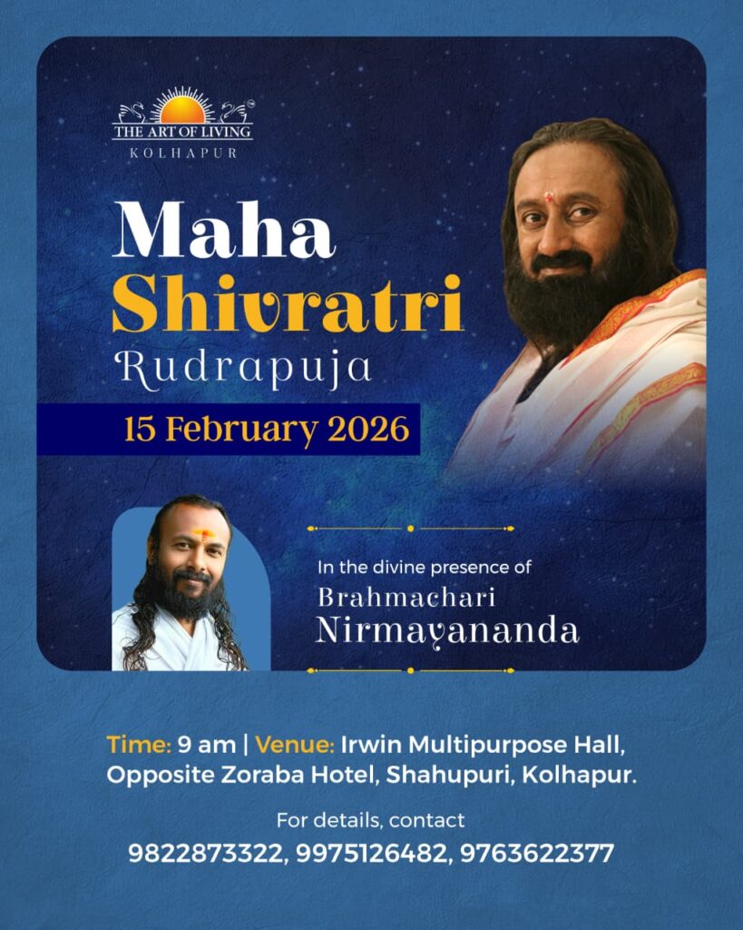 कोल्हापूर : Sri Sri Ravi Shankar यांनी संस्थापित केलेल्या The Art of Living संस्थेच्या वतीने महाशिवरात्री निमित्त विशेष आध्यात्मिक कार्यक्रमाचे आयोजन रविवार, दि. १५ फेब्रुवारी रोजी सकाळी ९ वाजता आ मेमोरियल हॉल, गवत मंडई, शाहूपुरी येथे करण्यात आले आहे.
