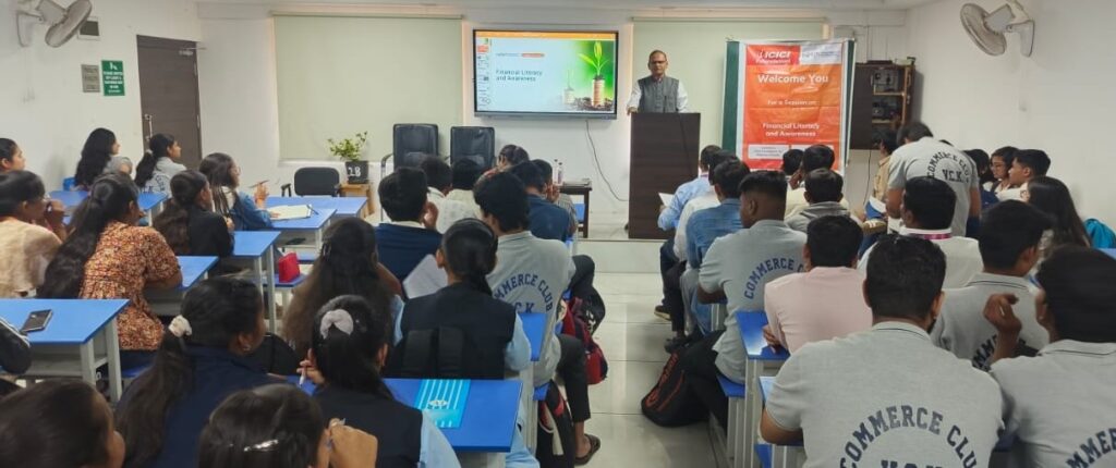 पहिल्या सत्रात डॉ. ककडे यांनी Financial Literacy & Awareness या विषयावर मार्गदर्शन करताना उत्पन्न-खर्चाचे योग्य नियोजन, महागाईचा परिणाम, SMART आर्थिक ध्येय निश्चिती, चक्रवाढ व्याजाची ताकद (Rule of 72), टर्म व हेल्थ इन्शुरन्सची गरज आणि आर्थिक स्वावलंबनाचे महत्त्व स्पष्ट केले. तसेच Ponzi Scheme आणि विविध आर्थिक फसवणुकांपासून सावध राहण्याचे आवाहन त्यांनी विद्यार्थ्यांना केले.सायबर गुन्ह्यांपासून सजगतेचा संदेश